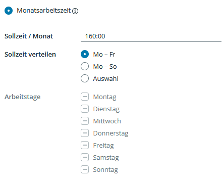 Wenn Sie für Ihre Mitarbeiter eine feste Sollarbeitszeit pro Monat vorgeben möchten, die unabhängig von der Anzahl der Werktage gleich bleibt, verwenden Sie die „Monatsarbeitszeit“. In diesem Fall werden die eingetragenen 160 Stunden auf die ausgewählten Werktage gleichmäßig aufgeteilt. Je nach Anzahl der Werktage in einem Monat ergeben sich unterschiedliche Sollarbeitszeiten.
