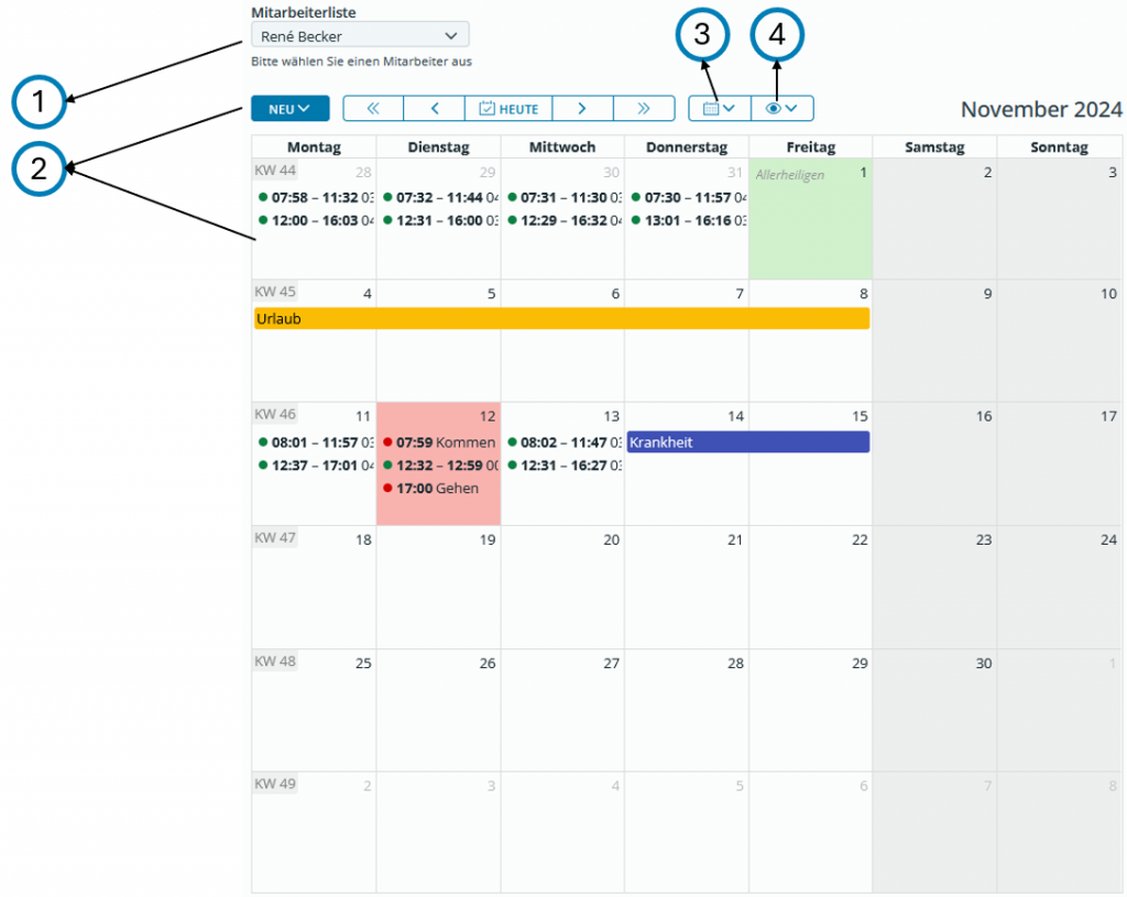Im Zeiterfassungskalender finden Sie alle Zeiterfassungsdaten Ihrer Mitarbeiter übersichtlich dargestellt. Hier können Sie neue Einträge erstellen und bestehende Einträge bearbeiten.